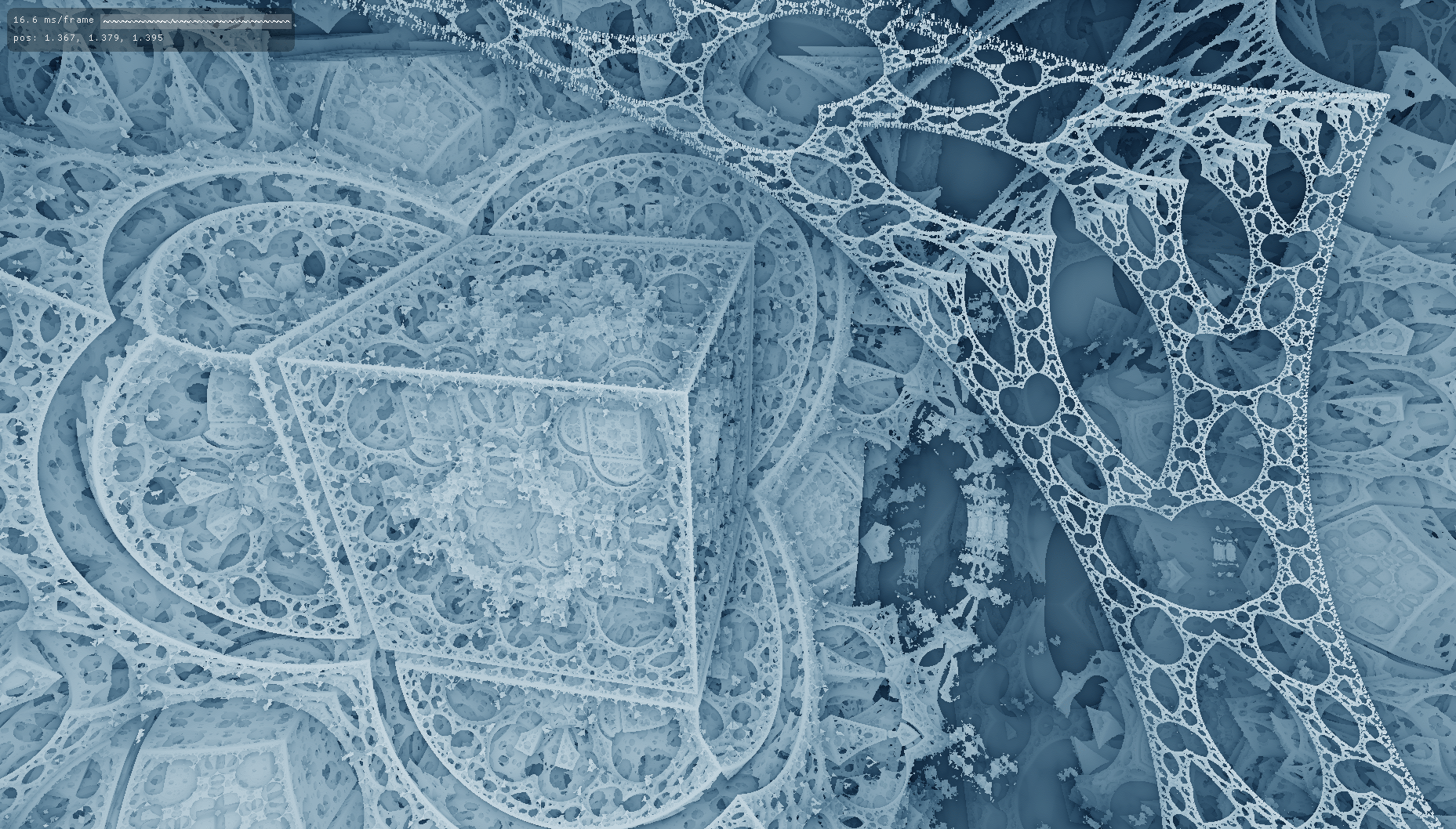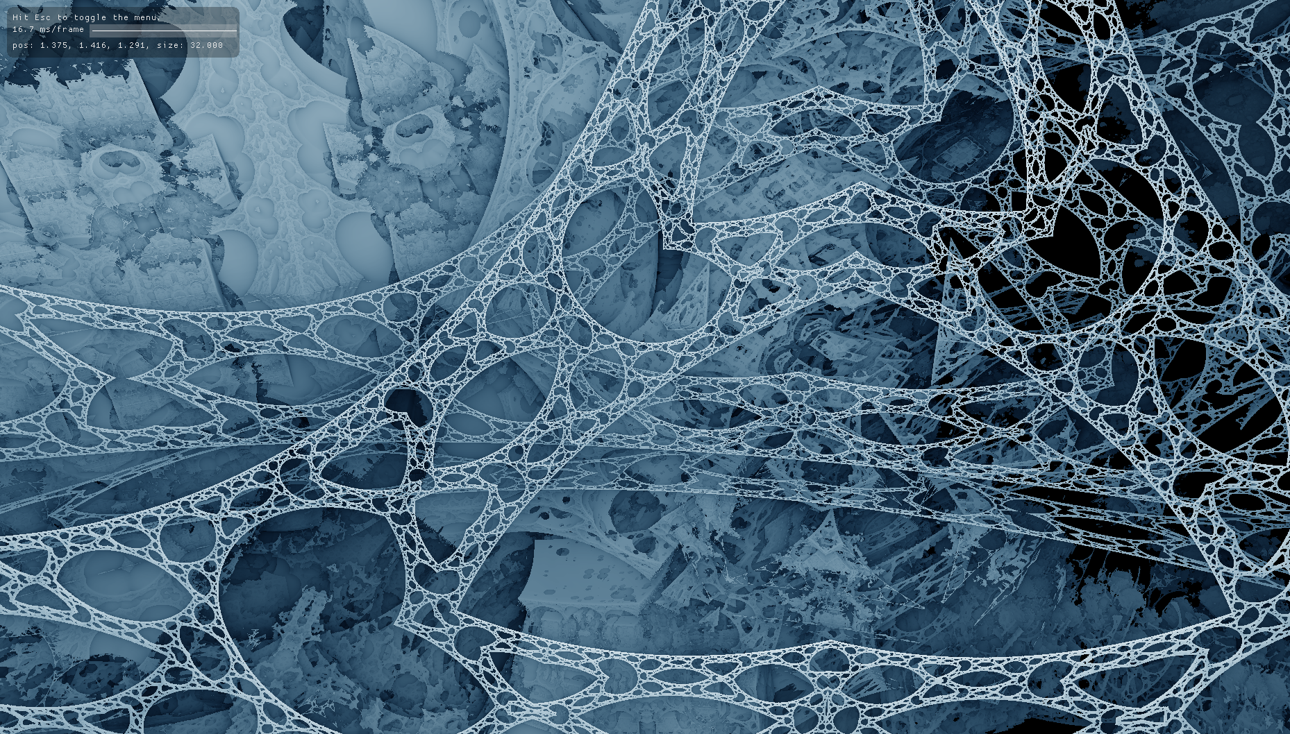 This program allows you to walk and fly through a 3D fractal. Hit Esc to toggle the mouse cursor and the menu. When the menu is closed, use the mouse, W, A, S, D and space to look around, move and jump. You can change your size and speed with the mouse wheel. Increasing your size can easily get you stuck. Hold left shift to temporarily disable collisions and gravity.
